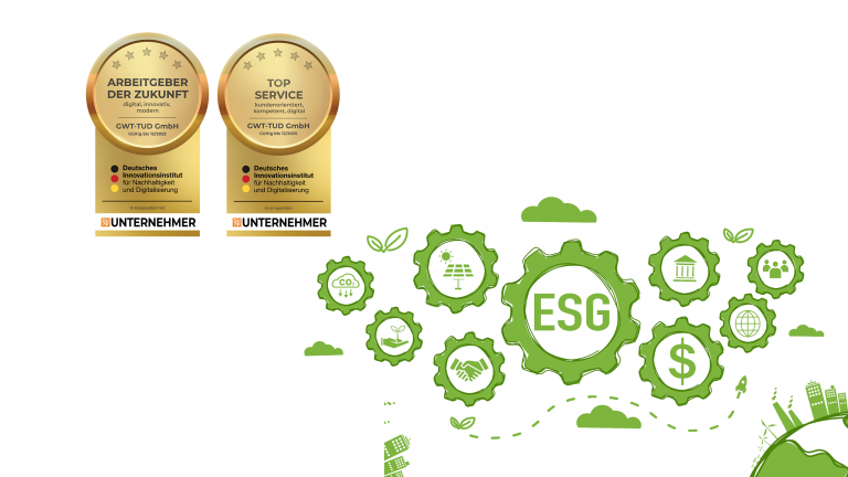 Das Deutsche Innovationsinstitut für Nachhaltigkeit und Digitalisierung (DIND) hat die GWT-TUD GmbH zum dritten Mal mit dem Siegel “Top Service“ sowie “Arbeitgeber der Zukunft“ ausgezeichnet. Beide Siegel unterstreichen den Anspruch der GWT sich für ein nachhaltiges Wirtschaften, sowohl in ökologischer, sozialer als auch unternehmerischer Hinsicht einzusetzen. Die hierfür relevanten Bereiche Umwelt, Soziales und Unternehmensführung (ESG) besitzen im operativen und strategischen Geschäft einen hohen Stellenwert. Im Sinne einer langfristigen Nachhaltigkeit, bezieht die GWT in ihre Entscheidungen und Strategien alle drei Bereiche ein, um ressourcenschonend, wertschätzend und gemäß der EU-Richtlinie 2022/2464 zur Nachhaltigkeitsberichterstattung von Unternehmen (CSRD) nach innen und außen zu agieren.